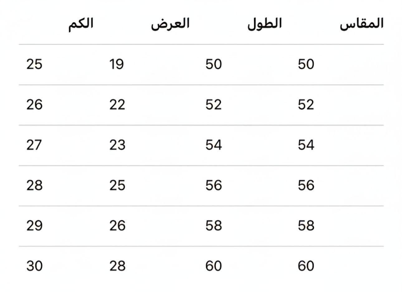 •لا يتم تعديل المقاسات أو تنفيذ مقاسات خاصة.